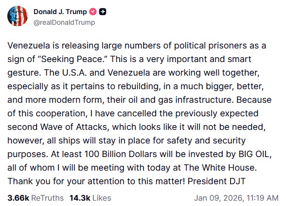 За словами президента США, у Венесуелі почали відпускати політв’язнів, що він назвав “важливим і розумним жестом”.