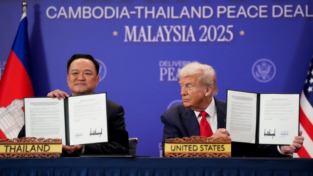 Donald Trump, az Egyesült Államok elnöke részt vett a Thaiföld és Kambodzsa közötti békemegállapodás aláírási ünnepségén október 26-án, vasárnap, számolt be a CNN.